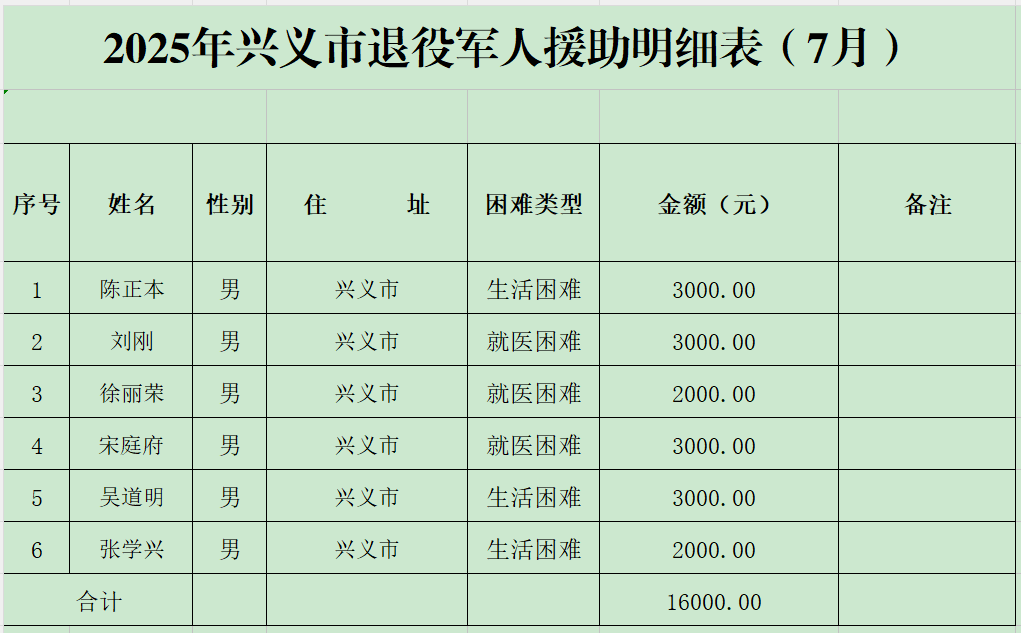 2025年兴义市退役军人援助明细表(7月)